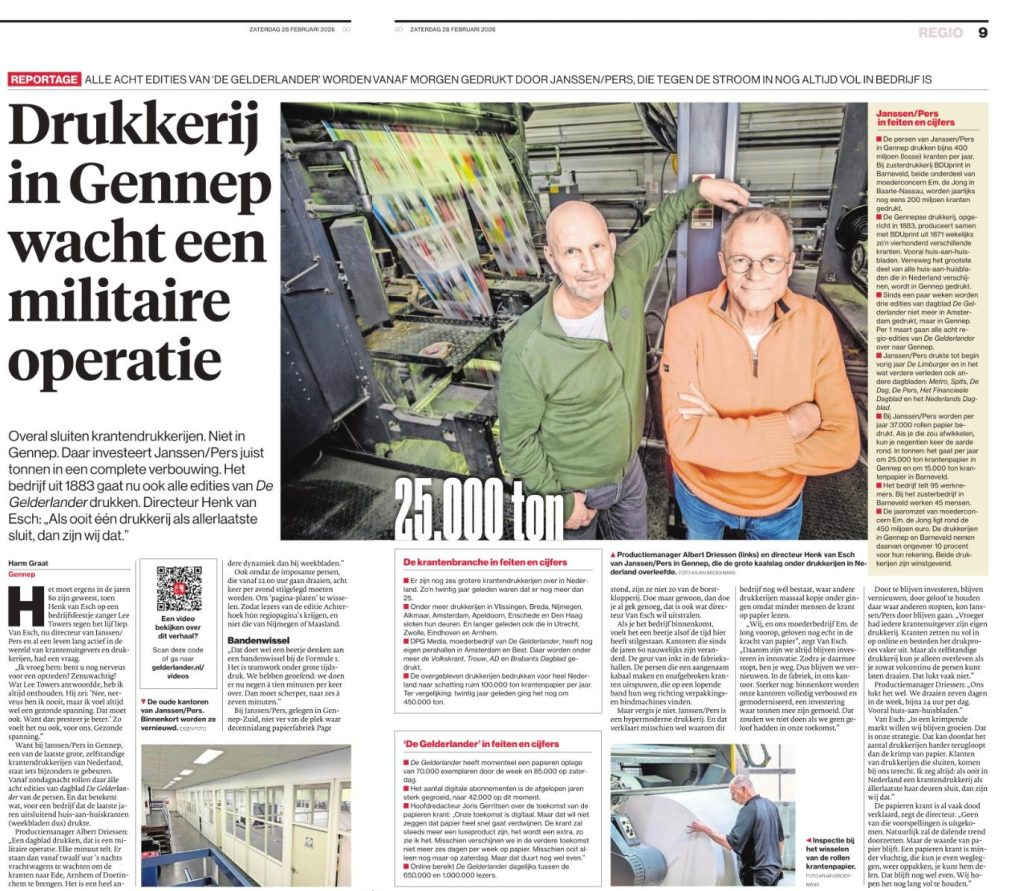 Een bijzonder moment voor Janssen/Pers Rotatiedruk is dat de drukkerij opnieuw een groot dagblad gaat produceren. De afgelopen jaren lag de focus vooral op het drukken van huis-aan-huiskranten en regionale weekbladen. Daarmee groeide de drukkerij uit tot een belangrijke speler in de markt voor lokale nieuwsbladen.